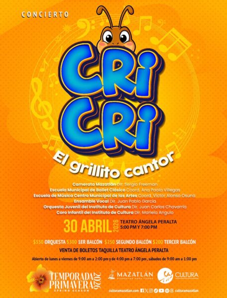 Thursday April 30: Concert: Cri Cri El Grillito Canto – with Camerata Mazatlan [Sergio Freeman], Escuela Municipal de Ballet Clásico; Escuela de Música Centro Municipal de las Artes; Orquesta Juvenile del Instituto de Cultura and Coro Infantil del Instituto de Cultura. Celebrate Children’s Day with “Cri Cri, el grillito cantor,” a colorful family production. The show celebrates the beloved songs of Mexican composer Francisco Gabilondo Soler, known as “Cri Cri,” bringing to life the magical characters and stories that have delighted generations of children. This charming production is designed to make the whole family laugh, sing, and dream – more than 100 artists on stage. $350 – $200, 5 pm. and 7 pm.