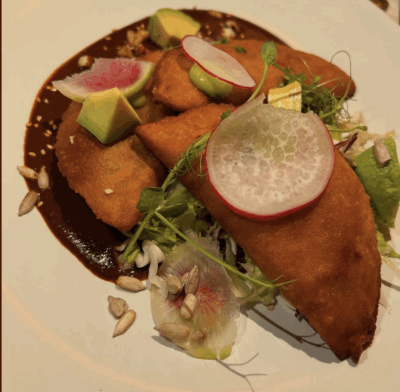 The chefs have carefully curated a outstanding menu that balances tradition, creativity, and value. Current offerings include Chile Capeado Relleno [$185], Birria [$190], Pollo en Mole [$240], Pollo a la Plaza [$200] Chile en Nogada [$240] Flautas de Chamorro [$210] and Chile Relleno de Queso [$185]. For a broader taste of the kitchen, the “gastronomic journey” offers three-course menus from $255 to $280, along with five plates designed for sharing. A favourite is the enmoladas de plátano [$150] three blue-corn tortillas filled with plantain purée and topped with an artisanal mole negro. A word about mole sauces: If you haven’t tried a dish with mole the simple explanation for this very complex sauce is that mole is a family of traditional Mexican sauces, usually thick and complex, made from chiles, spices, seeds and sometimes chocolate usually served over chicken or meat.