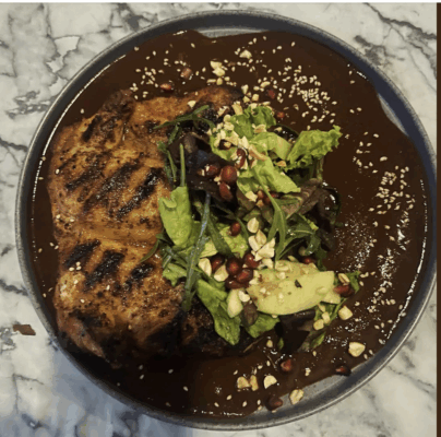 Chicken Mole, boneless, apple salad with peanut and pomegranate and cilantro rice, $240.