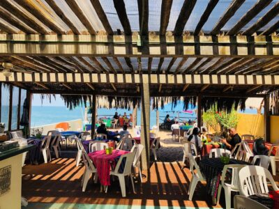 The scent of wood fire welcomes you to El Ranchito Feliz. Its rustic layout and earth floor set the stage for the scrumptious food that’s served here. This is a true “open-concept” kitchen: you’re sitting right in the middle of it. Tortillas are swiftly being baked on the ‘comal’ griddle, while on the other side they create your breakfast or lunch with the staple boiled beans on the side. With five breakfast dishes: machaca, chicharrón, marlin, nopales or eggs for $60 or seafood lunch options (breaded, grilled, garlic or ranchero shrimp, fried fish, ceviche or aguachile) any choice is a tasty one.