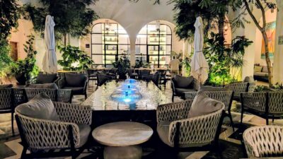 Before you dive into dining you may want to experience the large patio with comfy chairs, umbrellas, a bubbling fountain and yes, a full bar where you can enjoy sipping on craft cocktails. This divine courtyard is open to the public – the hotel guests have their own exclusive courtyard.